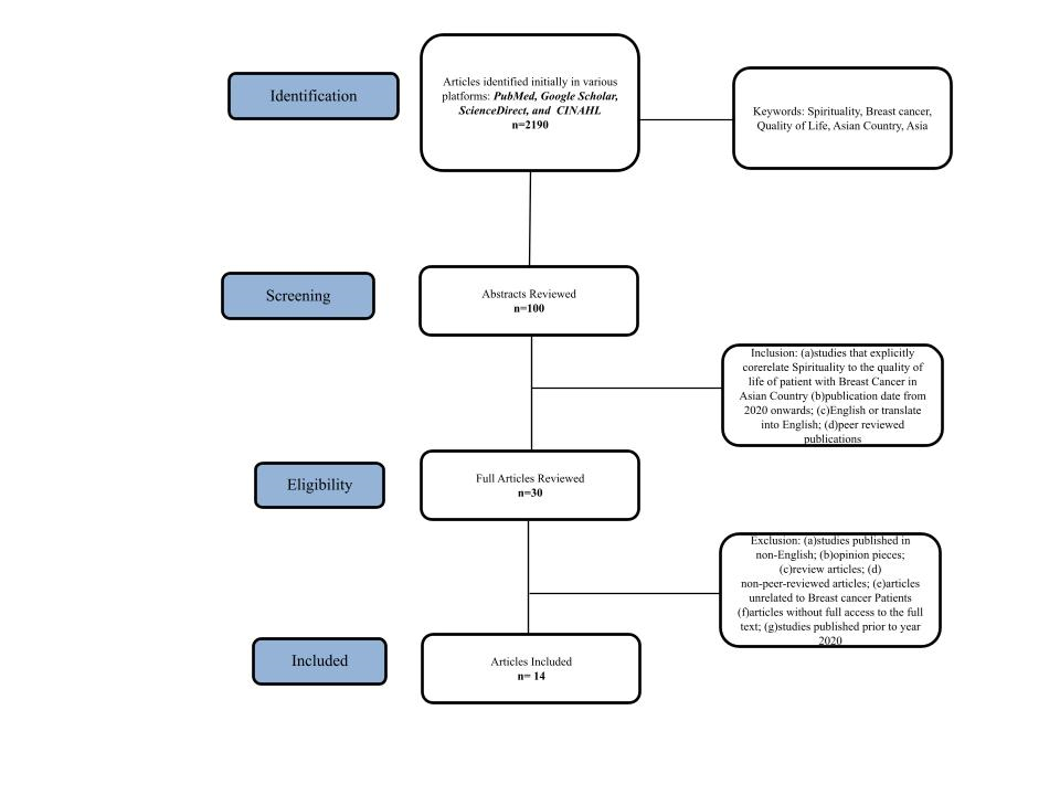 This review included peer-reviewed studies published between January 2020 and June 2023, in English or translated into English, and directly focused on telehospice or remote hospice care. Studies were excluded if they were non-English without translation, did not provide full-text access, were opinion pieces or secondary sources, addressed telehealth without a telehospice component, or were published before 2020. This ensured a contemporary, high-quality dataset on telehospice services during the COVID-19 pandemic.
