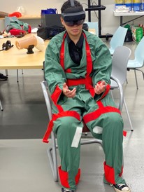 The workshops took place at the Ontario Shores Centre for Mental Health Sciences in Whitby, Canada. We employed a simulation-based approach aligned with best practices in HCP education, consisting of three structured phases: a pre-brief to set expectations and prepare participants; the simulation experience itself, which used an AR headset (Microsoft Hololens 2) and an aging suit to simulate how PLWD might experience tasks such as setting a table, making a sandwich, and taking a pill (see Figure 2); and a debrief to facilitate reflection, discussion, and integration of learning. Throughout the process, observational field notes were taken. After the debrief, each participant completed the TEQ and SCIDS questionnaires. A follow-up focus-group session was conducted.