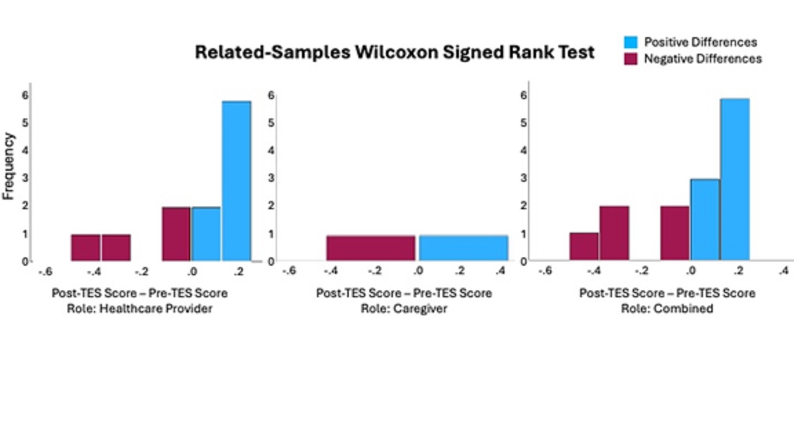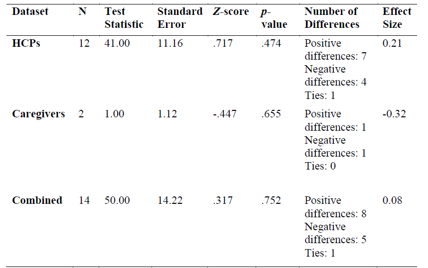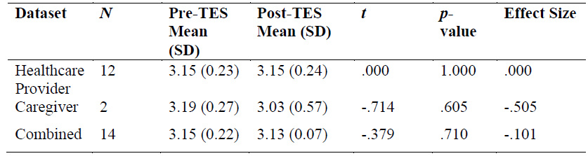 In a paired samples t-test, no significant difference was found in the mean scores for the TES before and after the simulation for HCPs, caregivers, or the combined dataset (see Table 3).