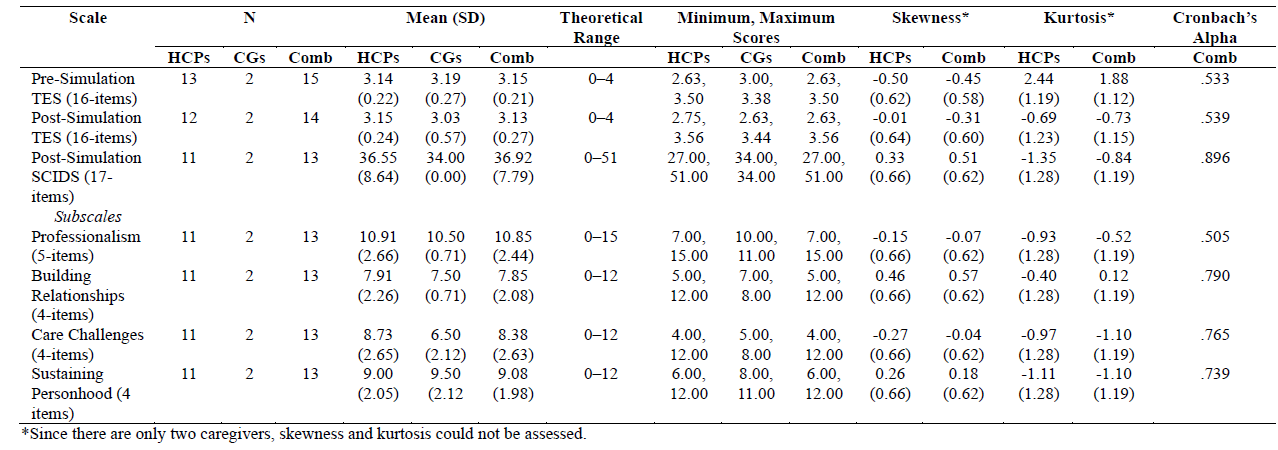 In the combined dataset, a total of 13 HCPs and 2 caregivers completed the pre-simulation TEQ and post-simulation TEQ. One HCP did not complete the post-simulation TEQ and two HCPs did not complete the post-simulation SCIDS. The mean and standard deviation for pre-simulation TEQ, post-simulation TEQ, and post-simulation SCIDS are 3.15 (0.21), 3.13 (0.27), and 36.92 (7.79), respectively (see Table 1). The pre-simulation and post-simulation TEQ scores are slightly positively skewed (greater distribution to the left), while the post-simulation SCIDS scores are slightly negatively skewed (greater distribution to the right of the curve), but all are in an acceptable range for skewness. The post-simulation TEQ and SCIDS scores have a slightly flattened curve (platykurtic), and are within the acceptable range (less than 2). The pre-simulation TEQ scores have a peaked curve (leptokurtic) and are just above the acceptable range (more than 2). The internal consistency (Cronbach’s alpha) for the pre-simulation and post-simulation TEQ are relatively low, while the post-simulation SCIDS is at an acceptable level, including for three of the four subscales.