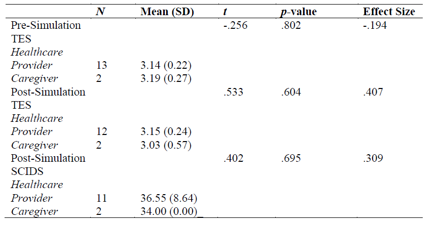 When comparing HCPs and caregivers in an independent samples t-test, there is no significant difference in the pre-simulation TES, post-simulation TES, and post-simulation SCIDS (see Table 4).