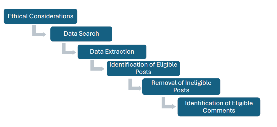 A qualitative, exploratory approach was applied to systemically identify, extract, and analyze publicly available Reddit posts and comments related to AI scribe technology. See Figure 1 for the methodological approach.