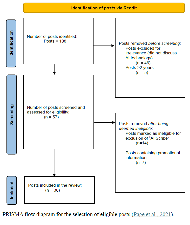 Reddit was selected due to the anonymous, candid discussions that are publicly available within large asynchronous, profession-specific forums. The primary author searched Reddit forums related to AI scribes using the search terms “nurse practitioner” and “family medicine” and “AI scribe” using the “all time” feature on two separate subreddits: r/familymedicine and r/nursepractitioner. These subreddits were chosen due to their direct relevance to the topic. The author manually reviewed the relevant post titles.