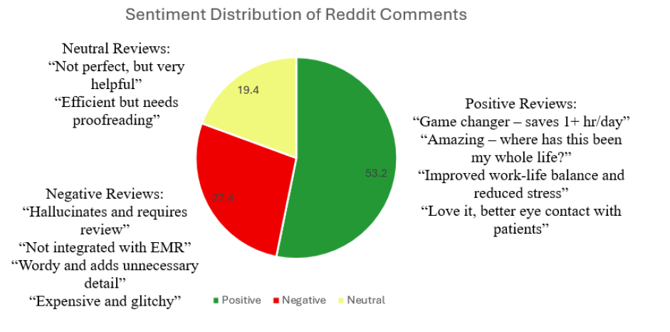 The final theme saw users discuss fear surrounding AI scribes replacing human scribes or even HCPs. Others reflected that an AI scribe could replace a history-taking interview but would never be able to replace HCP’s ability to use experience, critical thinking, and emotional intelligence to formulate a diagnosis and/or differentials. One commenter stated, “we cannot compete with the learned experience of a computer, but [I] think humans still want humans to care for them.” New graduate HCPs thought that using AI scribes reduced learning opportunities as they developed their practice and skillset. Furthermore, users noted a lack of training or support from health authorities or employers, leaving the onus on HCPs to decipher AI scribes’ role within their practice. Overall, AI scribes contribute to the reshaping of professional roles as HCPs integrate it into practice. For instance, HCP roles evolve by reducing tasks (e.g. documentation responsibilities) and introducing new tasks related to data management and patient communication. Generally, users felt that AI scribes should be viewed as a supplemental complement to practice, rather than replacement of HCPs. See Figure 4 for a visual representation of the percentage of comments by sentiment category.