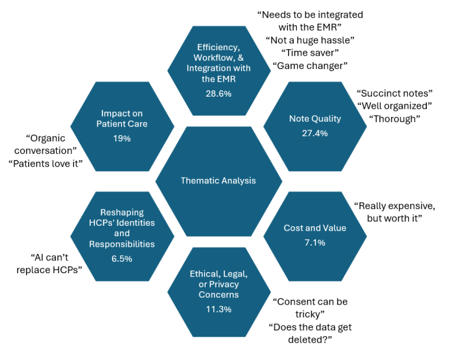 The themes indicated that users’ benefits were endorsed by improvements in productivity, patient-provider presence, and work-life balance. Some users noted that AI scribes were the beginning of a new technological era and expressed enthusiasm with their experiences. The strongest theme throughout is that using AI scribes is a practice-altering innovation for improving efficiency, decreasing burnout, and documentation and cognitive burden. These results are aligned with existing studies completed on AI scribes in healthcare. For instance, positive impacts of AI scribes were noted in previous studies and included decreased documentation time and improved productivity (Ma et al., 2025; Sasseville et al., 2025; Shah et al., 2025; Tierney et al., 2024; van Buchem et al., 2024). HCPs’ interactions with patients improved due to the increased ability to engage in conversations without looking at the computer screen (Duggan et al., 2025).
