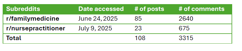 A manual search yielded 108 posts containing 3315 comments. The subreddit r/familymedicine generated 85 posts (2640 comments), and the r/nursepractitioner resulted in 23 posts (675 comments). R/nursepractitioner subreddit data was collected on June 24, 2025, while r/familymedicine subreddit data was collected on July 9, 2025. Posts made after these dates were excluded from the data collection. See Table 1: Subreddits Posts & Comments. The data was copied manually into Microsoft Word documents for organization and review. The number of relevant comments was counted manually. Although no formal file-naming system or spreadsheet structure was used in this small-scale study, the document was organized by subreddit. Notes were added within the document to indicate deleted usernames, excluded material, and comments removed during screening. This approach was selected due to the manageable dataset size and exploratory nature of the study.